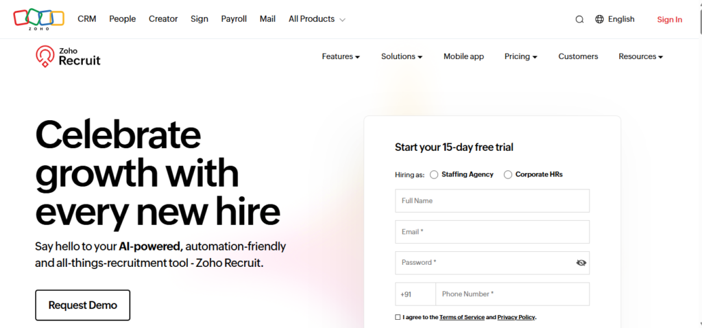 Zoho Recruit is a robust AI-driven ATS designed for businesses of all sizes — from startup HR teams to large staffing agencies. Its AI Resume Parser automatically extracts candidate details, skills, and experience from resumes, eliminating manual data entry. Semantic candidate matching helps recruiters find the most relevant profiles based on job descriptions, not just keyword matching.
